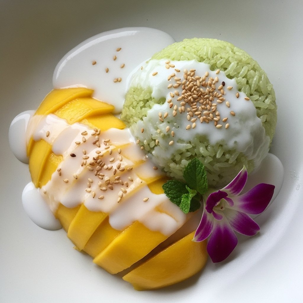 - Plate your dessert: Place a generous mound of the sticky rice next to the mango slices on each plate. Drizzle the reserved coconut sauce over the rice. Sprinkle toasted sesame seeds or mung beans atop for a subtle crunch and garnish with fresh herbs if desired.