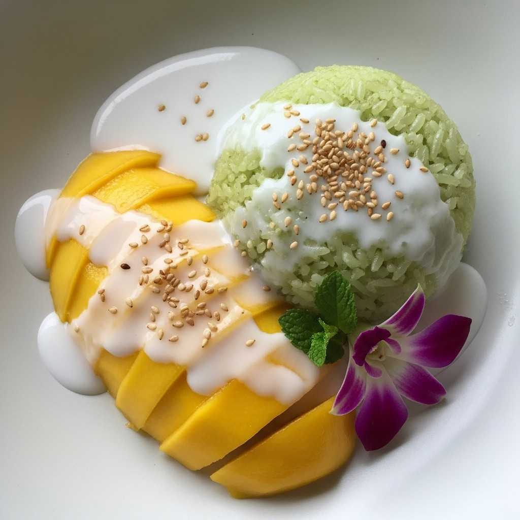 - Plate your dessert: Place a generous mound of the sticky rice next to the mango slices on each plate. Drizzle the reserved coconut sauce over the rice. Sprinkle toasted sesame seeds or mung beans atop for a subtle crunch and garnish with fresh herbs if desired.